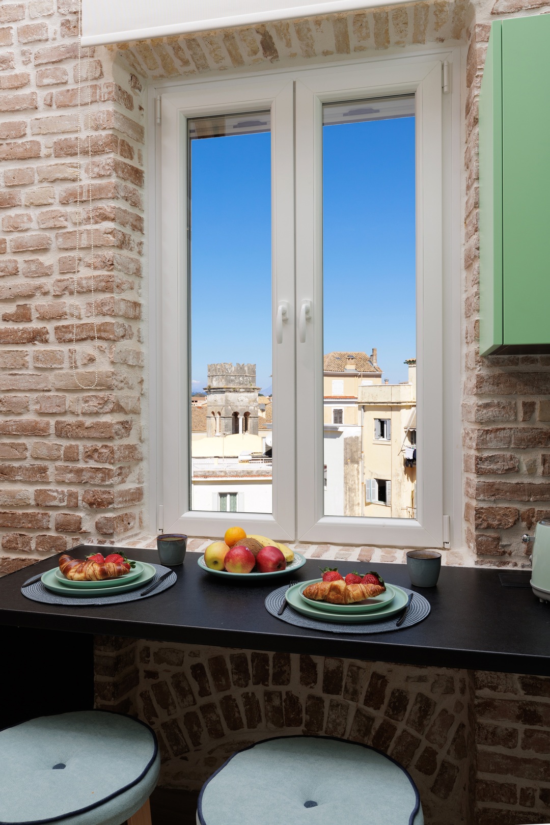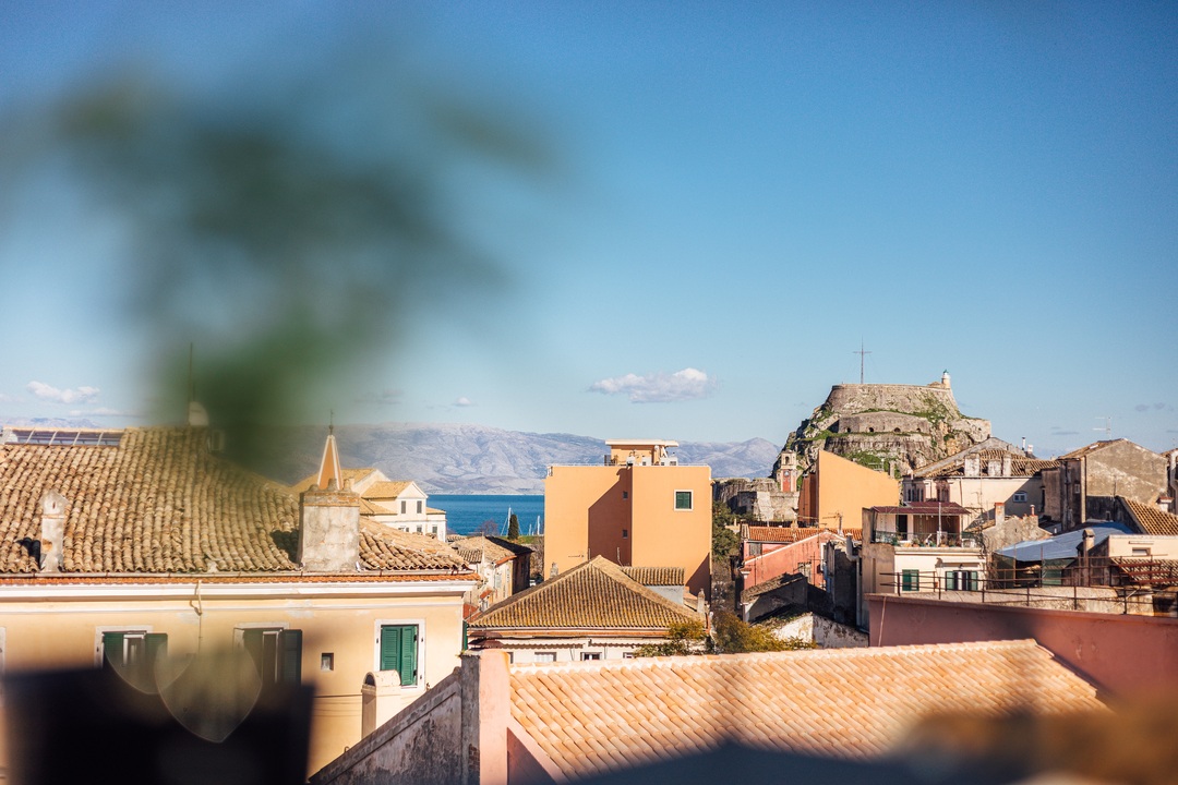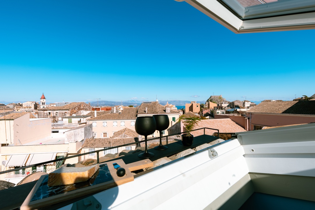 Chaque suite propose.une lucarne qui peut être transformée en petit balcon afin de pouvoir profiter d'une vue panoramique pittoresque et dégagée sur la vieille ville de Corfu.